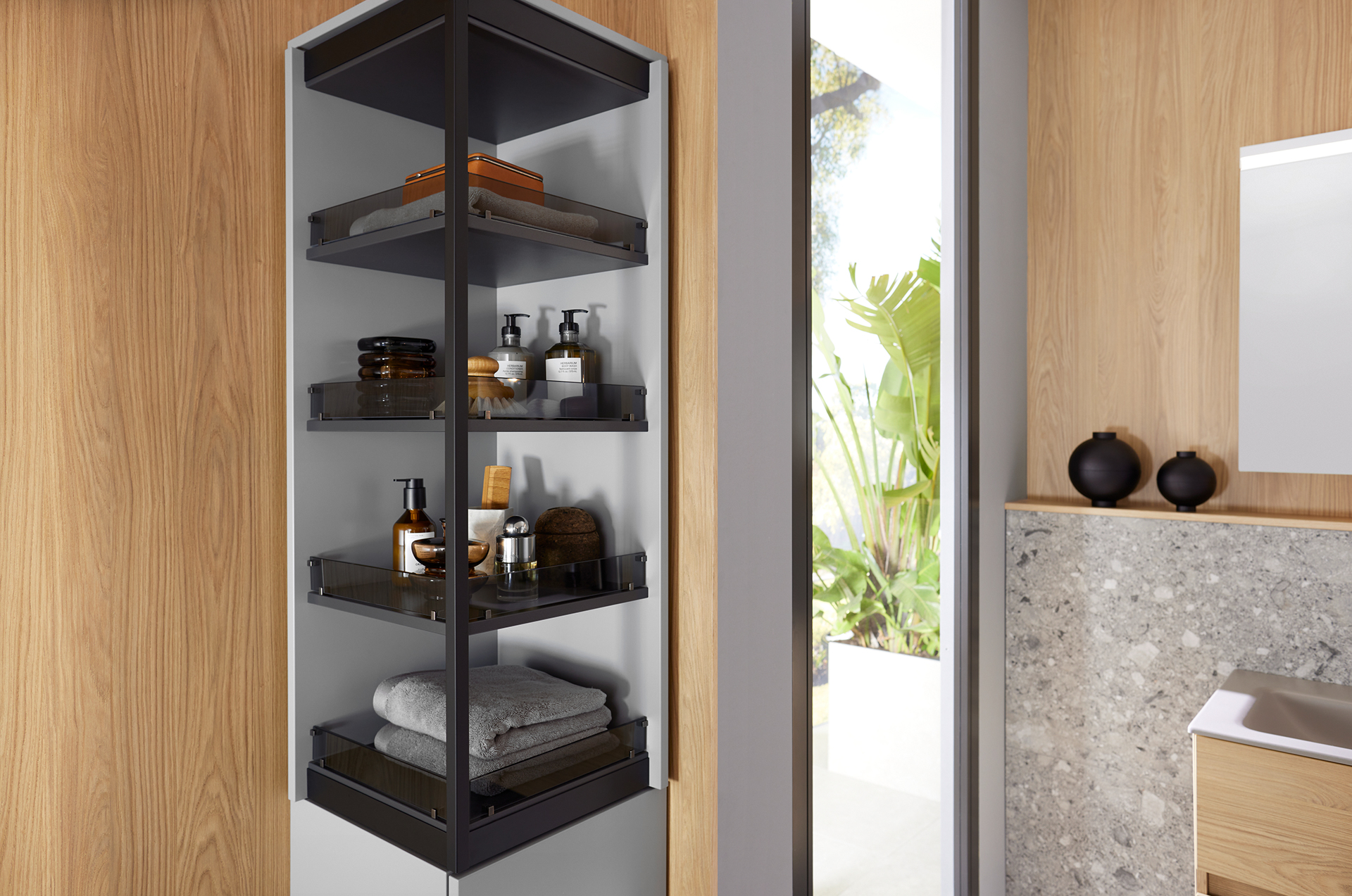 Das Prinzip der neuartigen Öffnungsmechanik ist einfach und verblüffend zugleich: Mit einer spielend leichten Rotationsbewegung dreht sich beim MagicTwist von burgbad ein quadratischer Innenschrank um 180 Grad – mit nur minimalem Ausscheren aus der vertikalen Mittelachse. Das Drehmoment ist so ausbalanciert, dass auch kostbare Inhalte wie etwa Parfum-Flacons nicht ins Rutschen geraten. Ermöglicht wird dies durch einen innovativen Drehbeschlag, der unsichtbar in doppelten Böden versteckt ist. Damit erhalten Badnutzer einen einfachen Zugriff auf die hinten liegenden Bereiche des Schranks – und damit auch auf jene Flaschen, Körbe und Utensilien, die sonst immer im Dunkeln bleiben. Ist der Schrank geöffnet, steht keine Tür im Weg.