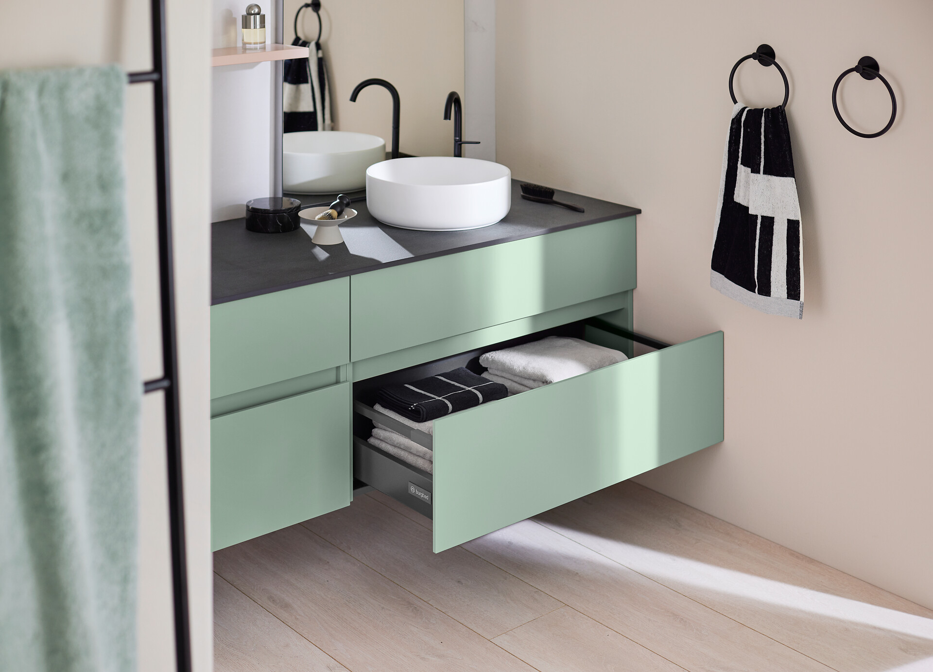 Zu der Vielfalt an Oberflächen und Farben kommen die unendlichen Möglichkeiten an Möbeltypen, Maßen und Kombinationen mit Konsollösungen und Waschtischen in diversen Formen und Materialien. Viele Elemente sind zudem in bis zu drei Dimensionen maßflexibel planbar. Zu den vielen Extras des sys30-Programms neu hinzugekommen ist der neue Hochschrank MagicTwist – ein Verwandlungskünstler, der dank eines innovativen Drehbeschlags den geschlossenen Schrank im Handumdrehen in ein offenes Regal verwandelt und so den Stauraum bis in den hintersten Winkel komfortabel erschließt. Und in Kombination mit dem neuen, besonders hygienischen und reinigungsfreundlichen Raumsparsiphon burgbad cleanFlow werden die mit sys30 planbaren offenen Konsolenlösungen mit (nun auch staubaren!) Aufsatzwaschtischen zur eleganten Universal Design-Lösung.